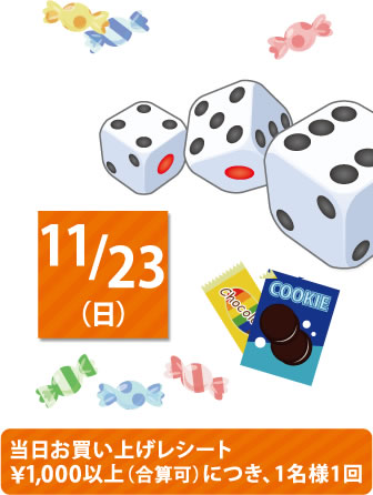 大きなサイコロを3回振って、出目に応じてお菓子をプレゼント!